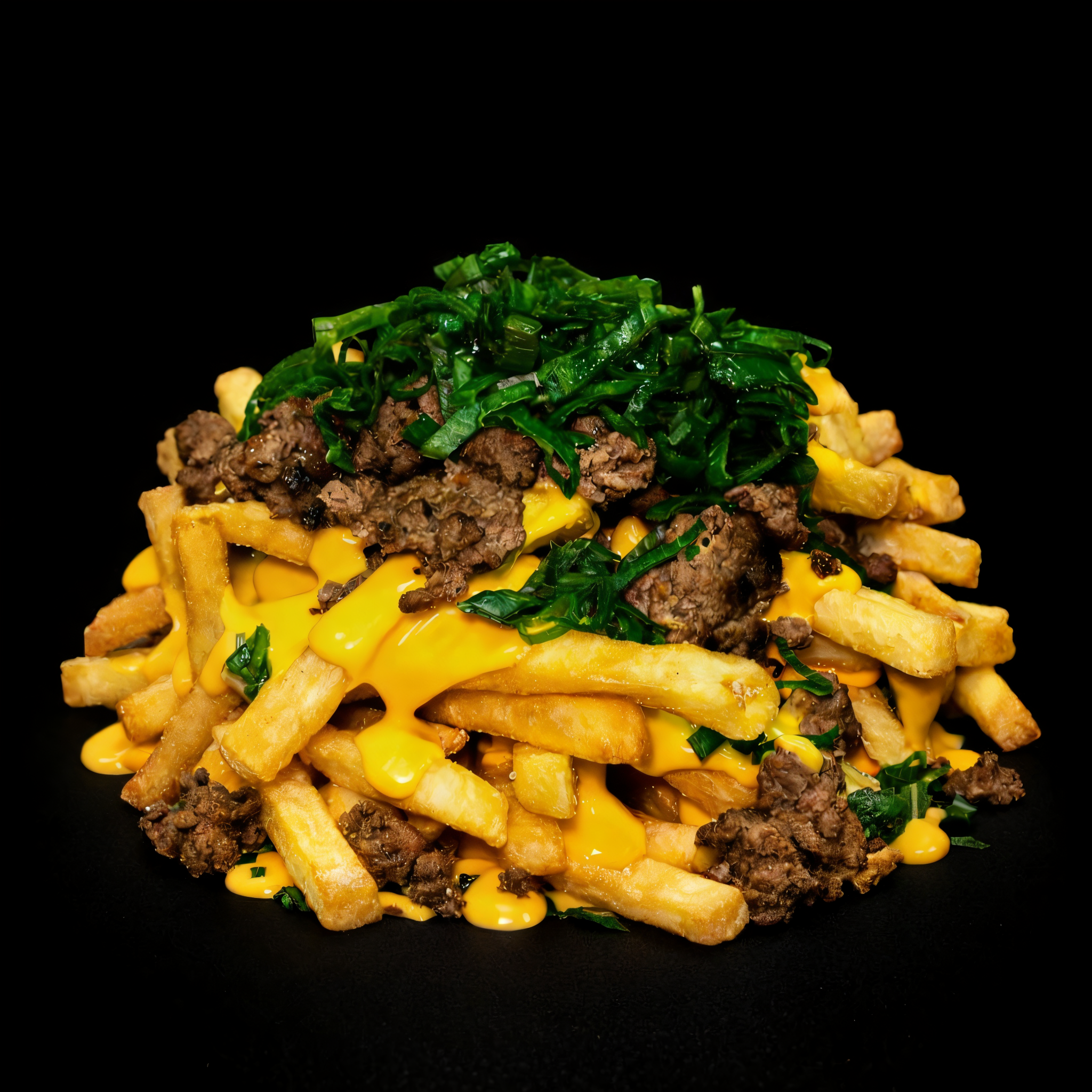 Papas fritas, salsa de queso cheddar, carne y cebollín. 1 persona