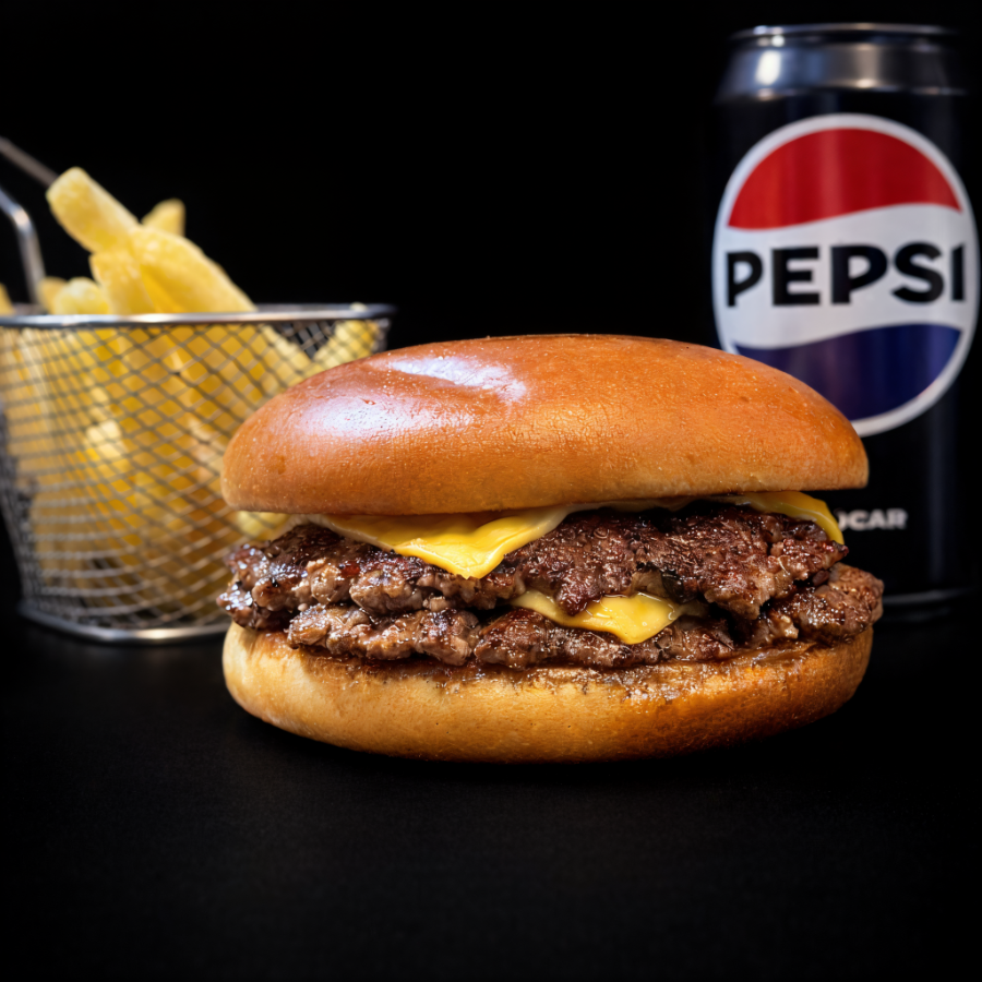 Hamburguesa Doble sultan (doble hamburguesa, doble queso cheddar) + papas fritas individuales + bebida en lata