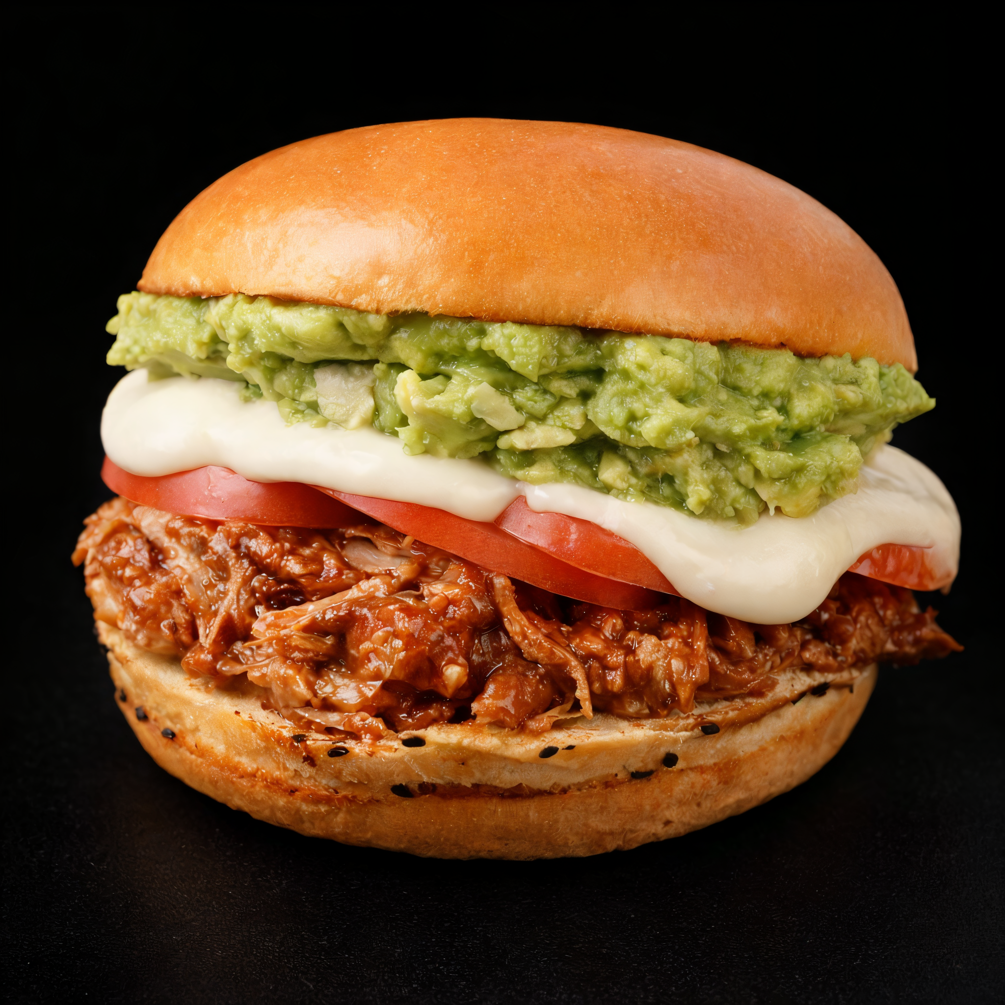 Mechada de vacuno, tomate, palta, mayonesa. Pan brioche.