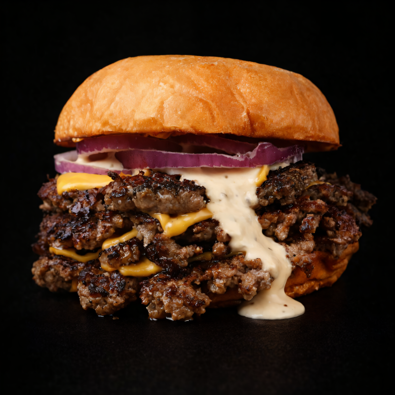4 hamburguesas, 4 queso cheddar, salsa sultán, cebolla morada. Pan brioche.